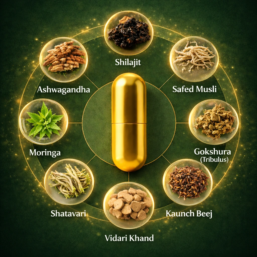 Hamare formula me shamil hain 8 premium jadibootiyan jo seedha root cause par kaam karti hain.